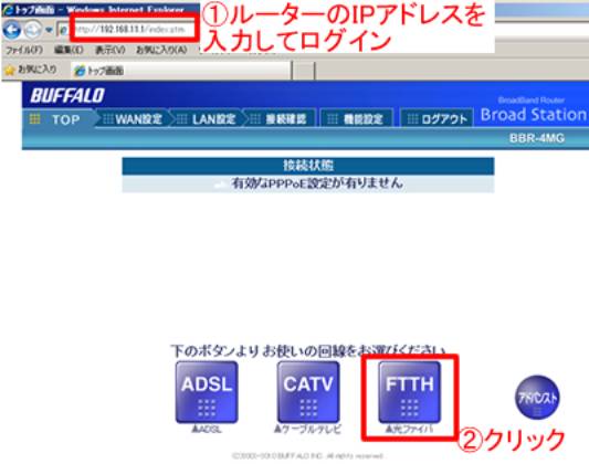 1.ルーターにログインし、「下のボタンよりお使いの回線をお選びください」から「FTTH」をクリックします。