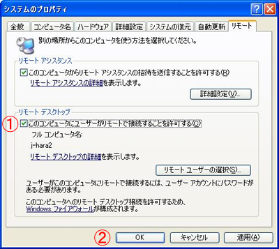 ①「このコンピュータにユーザーがリモートで接続することを許可する」にチェックを付けます。